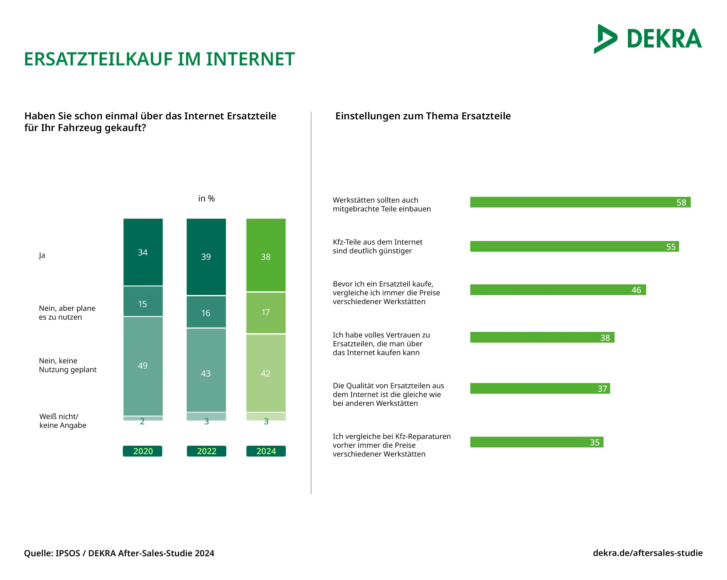 Wenn es um den Kauf von Ersatzteilen für ihr Fahrzeug geht, tendieren Deutschlands Autobesitzer langsam zu mehr Online-Käufen. Das ist eines der Ergebnisse einer aktuellen Befragung der Expertenorganisation DEKRA und des Marktforschungsinstituts Ipsos. 38 % der Befragten haben schon Autoersatzteile online gekauft, 17 % planen es, für 42 % kommt der Internet-Kauf nicht in Frage.