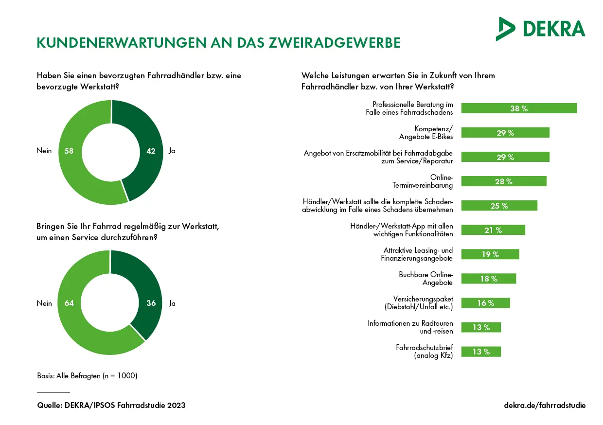 Die Studie untersuchte auch, welche konkreten Erwartungen die Fahrrad-Kundschaft an Fachbetriebe hat. Ganz oben rangiert dabei die professionelle Beratung im Fall eines Schadens (38 Prozent). Kompetenz zum Thema Pedelec bzw. E-Bike erwarten 29 Prozent; ebenso viele wollen ein Angebot für einen Mobilitäts-Ersatz, wenn das eigene Fahrrad in der Werkstatt ist. Auf dem vierten Platz der Prioritätenliste liegt mit 28 Prozent schon die Online-Terminvereinbarung – dass ihr Fachbetrieb das heute anbietet, sagen nur 19 Prozent der Befragten. Jeder vierte Fahrradbesitzer (25 Prozent) erwartet, dass der Fachbetrieb im Fall eines Schadens die komplette Schadenabwicklung übernimmt.