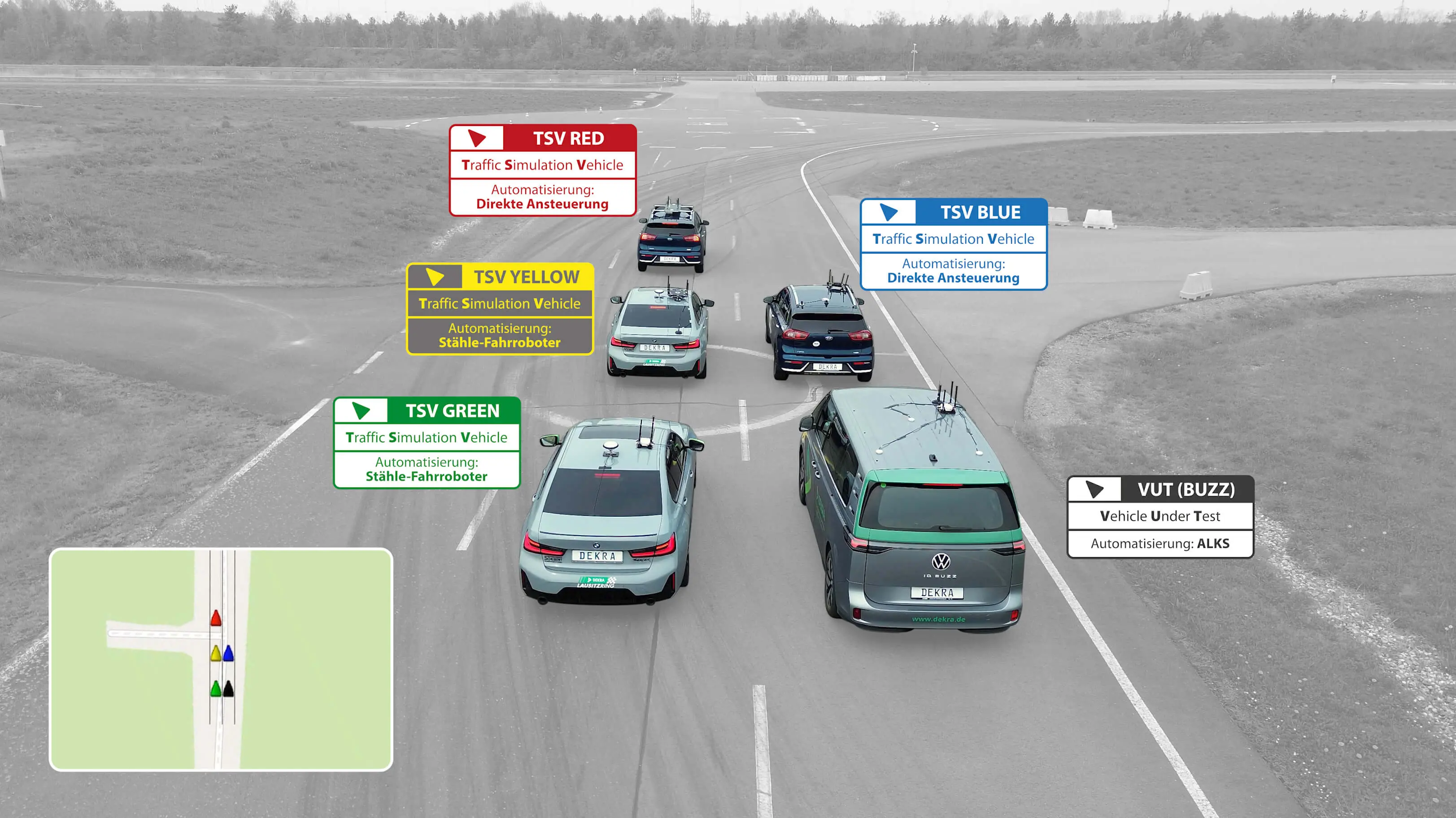 „Dank der Zusammenarbeit im Projekt, wo alle Beteiligten ihre jeweilige spezialisierte Expertise eingebracht haben, erreichen wir in den Testszenarien heute ein Niveau an Komplexität, die so mit keiner anderen verfügbaren Technologie auf dem Prüfgelände umgesetzt werden kann“, erklärt Konsortialleiter Felix Kocksch vom DEKRA Lausitzring. Im reproduzierbaren Testablauf wird ein Schwarm von Objekten punktgenau orchestriert. Das können mit Fahrrobotern ausgestattete Serienfahrzeuge sein, aber auch selbst fahrende Plattformen, die mit verschiedenen Soft-Targets beispielsweise Fußgänger, Radfahrer oder weitere Fahrzeuge simulieren. Das Fahrzeug, das getestet wird, befindet sich mitten in diesem Schwarm und wird in komplexe Situationen gebracht, auf die die automatisierten Funktionen jeweils richtig reagieren müssen.