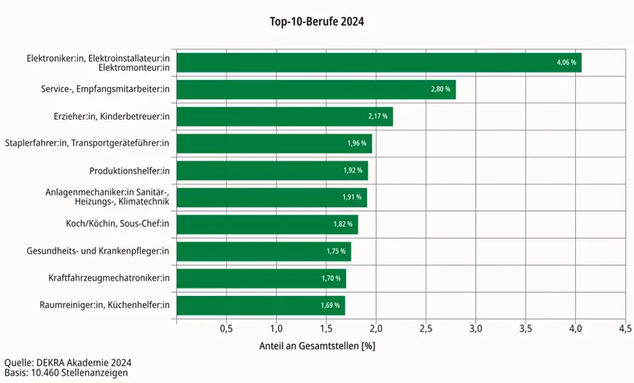 Für den aktuellen Arbeitsmarktreport der DEKRA Akademie wurden 10.460 Stellenangebote untersucht. Auf den ersten zehn Plätzen im Gesamtranking der Berufe gab es einige Überraschungen. Schon 2023 waren hier Stellenangebote für Fachkräfte mit Berufsausbildung sowie für angelernte Arbeitskräfte besonders präsent. Dieser Trend hat sich nun nochmal verstärkt und zum ersten Mal seit 2008 ist kein akademischer Beruf vorn mit dabei. Insbesondere die Entwicklung bei Softwareentwicklerinnen und -entwicklern überrascht: Sie waren unter den zehn am häufigsten gesuchten Berufen gesetzt und sind nun auf Position 19 zurückgefallen. Auch Elektroingenieurinnen und -ingenieure, die 2023 nach mehreren Jahren erstmals wieder unter den Top-10-Berufen vertreten waren, haben sich hier nicht gehalten (Platz 13).