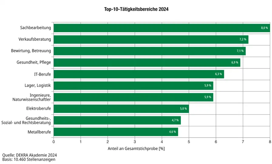 Die Stellenangebote der Stichprobe können 28 Tätigkeitsbereichen zugeordnet werden. Vakanzen in der Sachbearbeitung haben zum ersten Mal den höchsten Anteil. Arbeitgeber suchen hier insbesondere Fachkräfte für allgemeine Sachbearbeitungsaufgaben sowie Personalfachkräfte.
