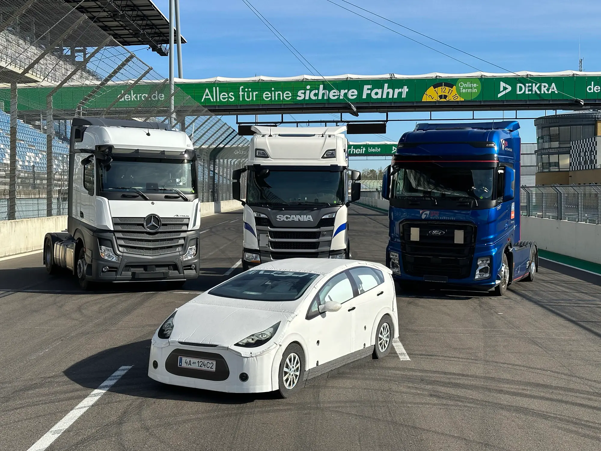 Effektive Verbesserungen sind daher vor allem durch aktive Sicherheitssysteme zu erzielen. Fahrerassistenzsysteme wie der Lkw-Notbremsassistent können Unfälle vermeiden oder die Unfallschwere verringern. Allerdings tun nicht alle Notbremsassistenten das so gut, wie es technisch möglich und wünschenswert wäre. Das ist das Ergebnis der Fahrversuche am DEKRA Lausitzring mit drei Sattelzugmaschinen verschiedener Hersteller. Die mit Messtechnik sowie Lenk- und Pedalaktuatoren ausgestatteten Lkw fuhren dabei jeweils mit einer Geschwindigkeit von 50 km/h geradlinig auf eine stehende Pkw-Attrappe zu – und zwar mit 100-prozentiger Überdeckung, also mittig auf das Heck des Targets.